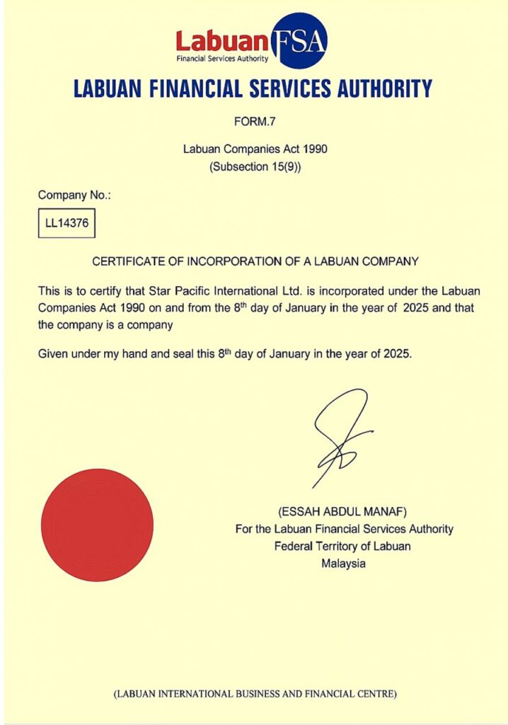 Star Pacific International Ltd. is officially incorporated under the Labuan Financial Services Authority, ensuring global recognition and compliance.